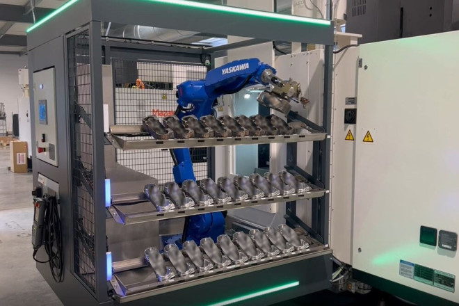 Tous les éléments périphériques au robot ont été développés afin de répondre entièrement au besoin du client. Sur cette application, un robot 6 axes de la marque YASKAWA a été mis en place.
